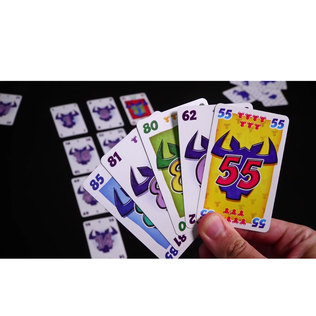 The game has 104 cards, each bearing a number and one to seven bull's heads symbols that represent penalty points. A round of ten turns is played where all players place one card of their choice onto the table. The placed cards are arranged on four rows according to fixed rules. If placed onto a row that already has five cards then the player receives those five cards, which count as penalty points that are totaled up at the end of the round. Rounds are played until a player reaches 66 points, whereupon the player with the least penalty points wins.