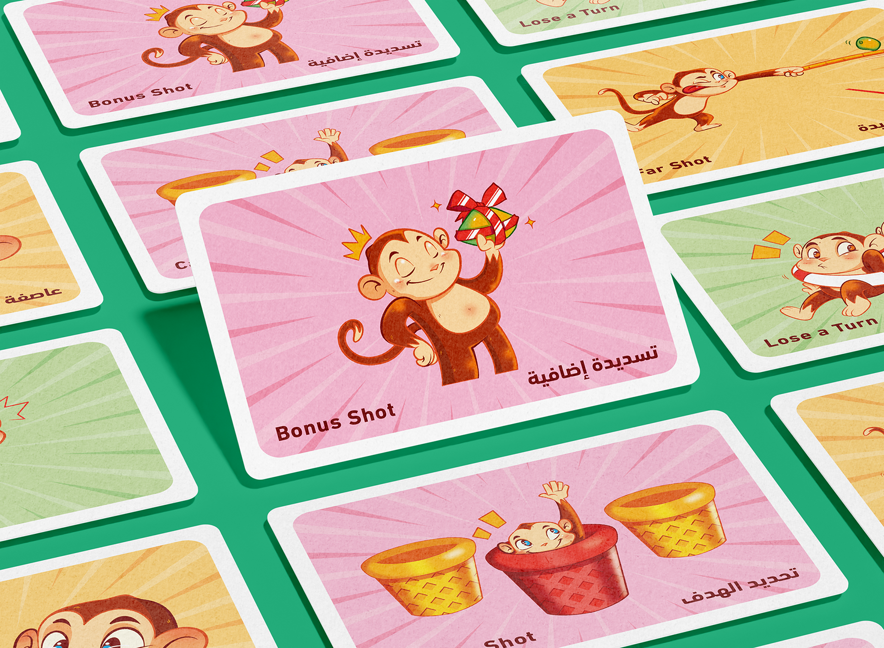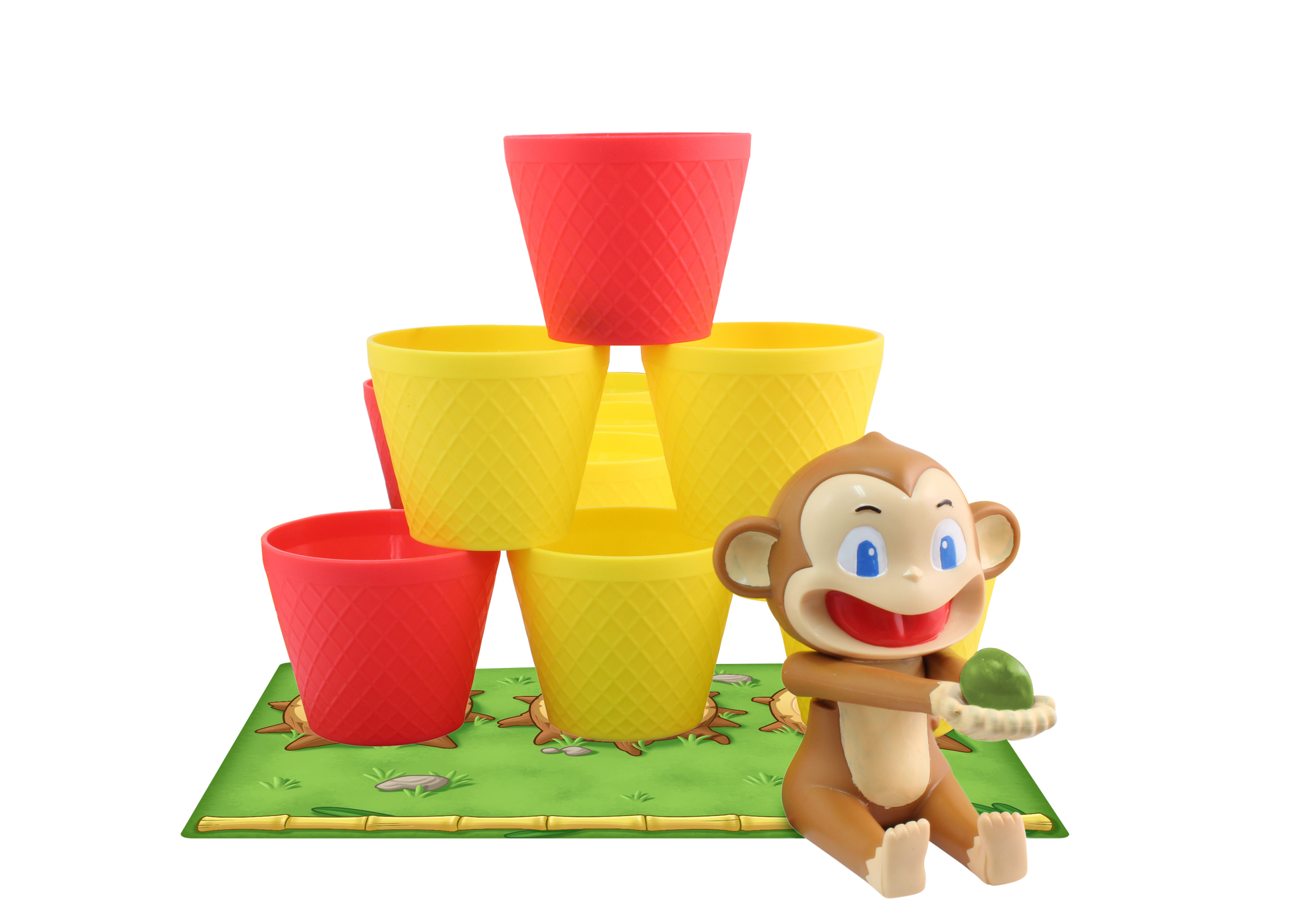 Coconuts is a dexterity game based on the "Monkey King" character from Chinese mythology. In the game, players launch coconuts toward a field of cups in the middle of the playing area. Land in a cup, and you get to stack it on your player board; land in a cup on someone else's board, and you get to move it to yours. By playing special "Monkey King Magic" cards, you can force opponents to shoot blind, take long shots, or otherwise bollix their efforts to cup a coconut. Whoever first completes a pyramid of six cups on his player board wins!